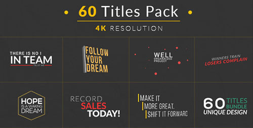 60 Titles Pack - Project for After Effects (Videohive) After Effects Version CS6 - CC 2015 | 3840x2160 | 11 May 16 | No plugins | 80MB |